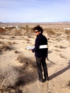 Registration in a new environment. Participant receives a TuningStake ( either directly from David Goodman or at BoxoHouse during visit). Walking from the front porch out into the front field of BoxoHouse. Participant looks directly in front of them to engage with surroundings. Participant walks in quietude. Participant places stake in the ground where they find rest/comfort/peace brought about by interacting with their surroundings: ie. listening to the wind, hearing the echoes of sound off the surrounding mountains, smell of Earth, warmth of Sun, vastness of Sky, vibrations of live ammunition from 29 Palms Marine Base, etc.